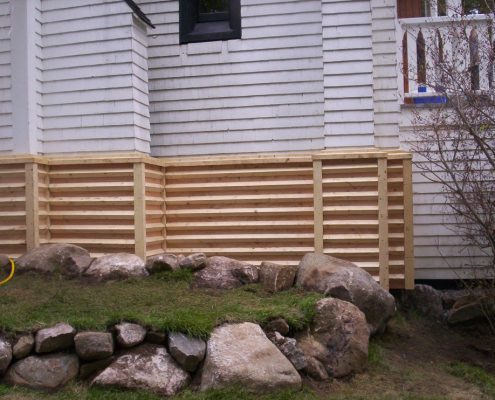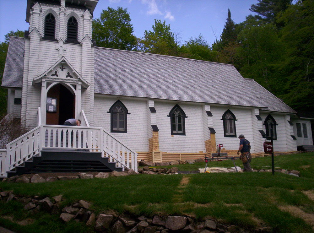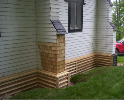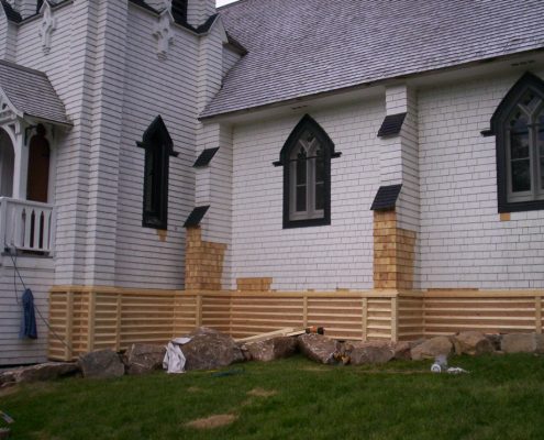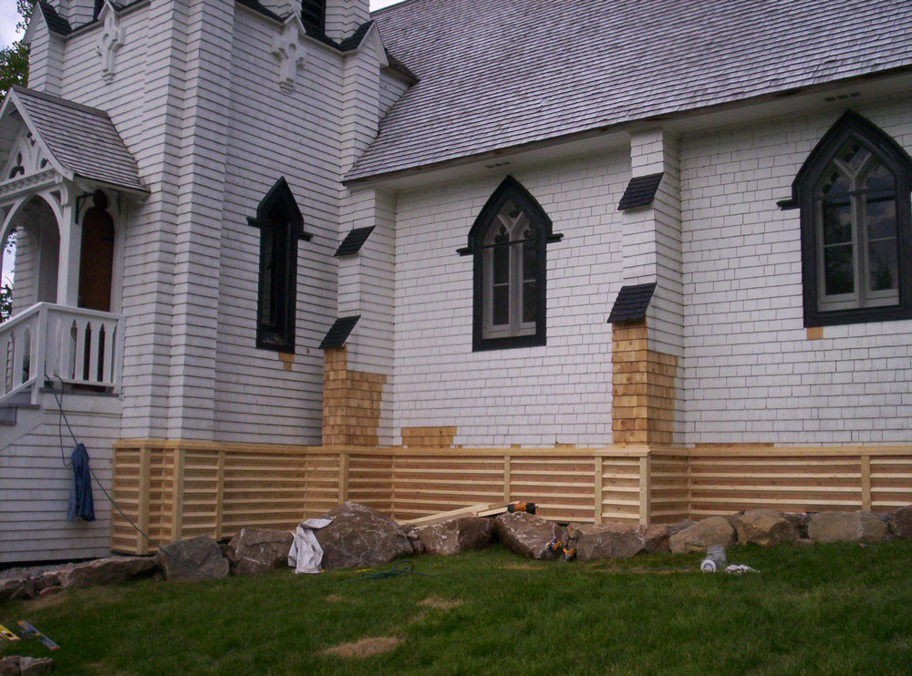 Réparation et installation de bardeaux de cèdre pour garder le cachet d’époque. Fabrication de moulure en atelier pour recouvrir le périmètre de la fondation.
